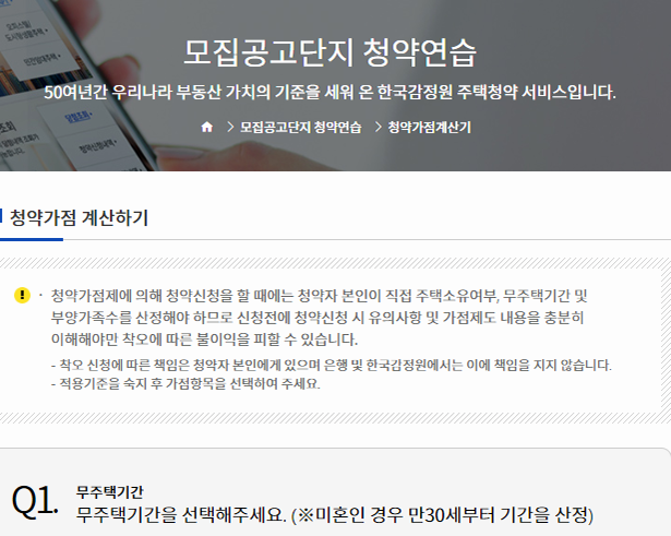 제가 알기로 청약을 실제로 넣기 위해서 찾는 분들 만큼이나 가점 계산기를 활용하기 위해서 홈페이지를 찾는 분들도 많으실 텐데, 혹시 계산기를 활용하기 위해서 방문하신 것이라면, 마찬가지로 메뉴를 누르고 질문에 답을 하면서 과정을 진행하면 됩니다. 앞서 얘기한 가상체험을 통해서 가점을 확인할 수도 있는데, 점수 자체만 확인할 땐 확실히 계산기가 더 편해요.