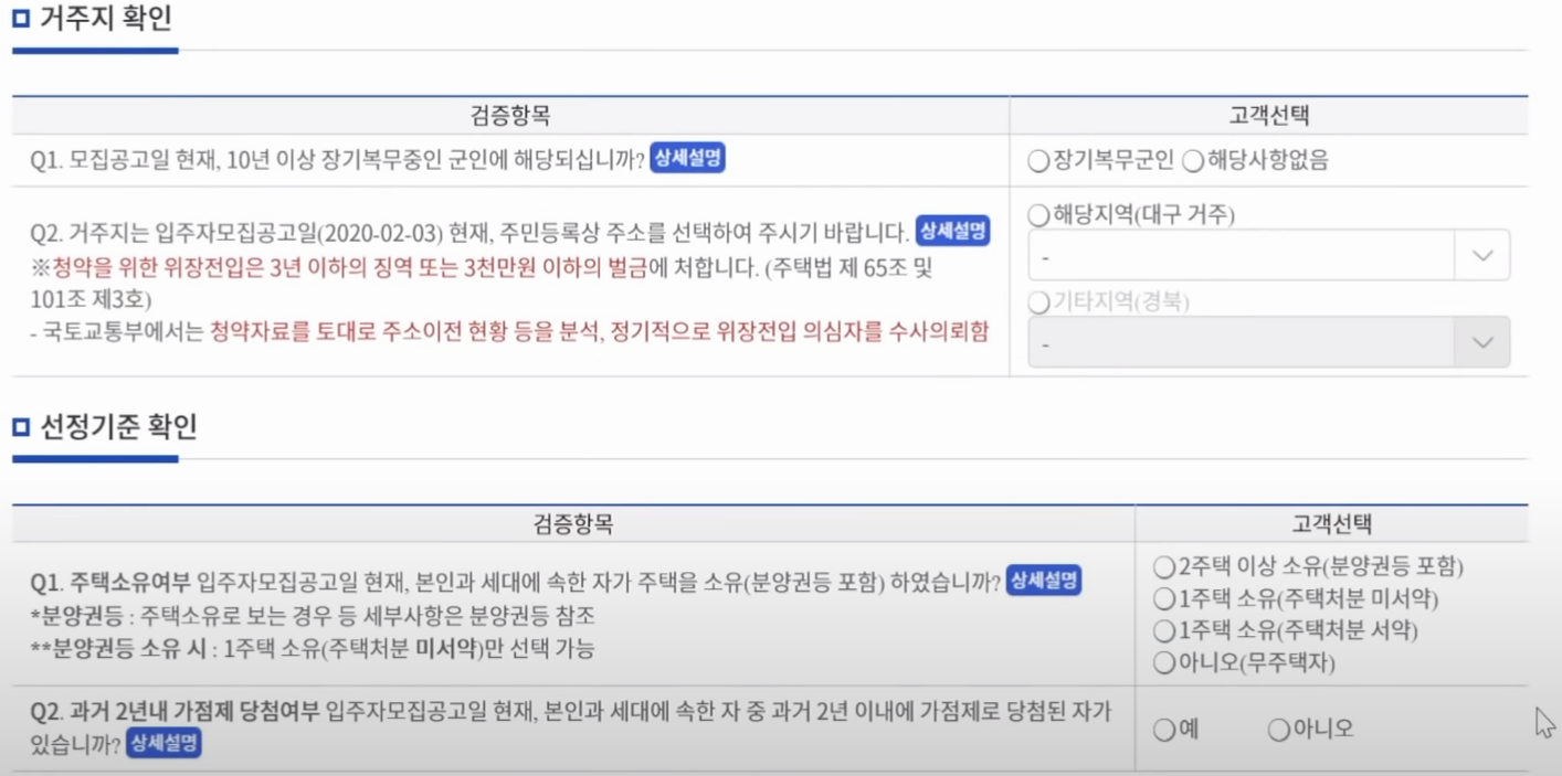 세 번째 단계에서는 거주지 확인과 선정기준 확인을 위한 항목 체크를 해야 하는데, 각각의 항목이 특별히 어려운 구석이 없어서 이 부분도 제가 세세하게 설명할 수 있는 부분이 없을 것 같아요. 지역 선택이나, 2년 이내 가점제로 당첨된 이력이 있는지 등은 저보다 청약을 신청하시는 분이 더 잘 알고 계시겠죠?