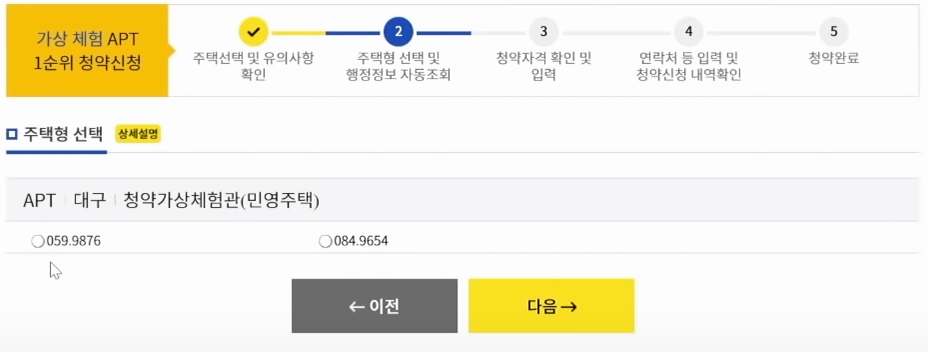유의사항이 있는 화면을 넘기면 주택형 선택 및 행정정보 자동조회를 위한 두 번째 단계가 시작됩니다. 가상체험을 할 땐 59와 84가 나오는데, 저는 84타입을 선택한 뒤에 과정을 진행해보도록 하겠습니다.
