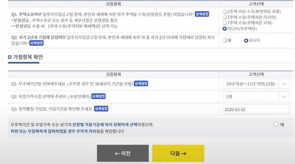 좌우간, 이런 방식으로 화면에 있는 항목들에 답을 하면서 가상 체험을 해보시면 됩니다. 부양가족수, 청약통장 가입일 및 가입 기간 등 이미 익숙하진 데이터만 입력하는 것이 전부이기 때문에 특별히 가상체험을 통해서 과정을 익히는 것이 어렵지는 않을 거예요.