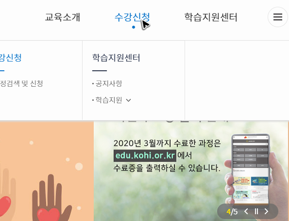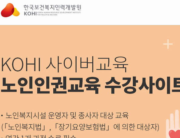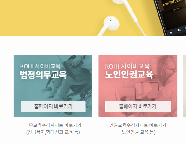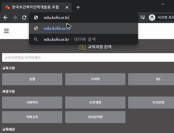 비밀스럽게 관리되면서 특별하게 알고 있는 사람들만 찾아갈 수 있는 그런 온라인 강의 사이트가 아니죠? 고로 검색하면 사이트를 찾아갈 수 있습니다. 다만, 이 글을 읽으시기 전에 이미 검색을 한 번 해보셨을 테니, 또 다시 검색하는 것은 귀찮을 수 있어요. 그러니 주소창에 [edu.kohi.or.kr]를 입력해서 한국보건복지의 인력개발원과 사이버교육의 홈페이지를 찾아주세요.