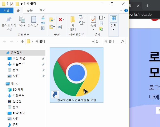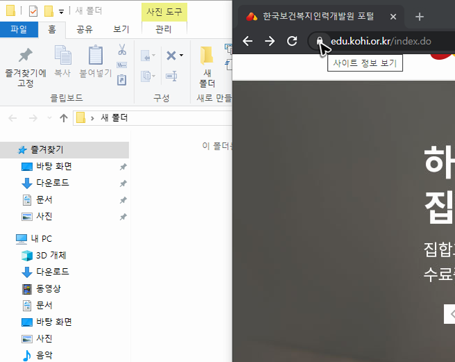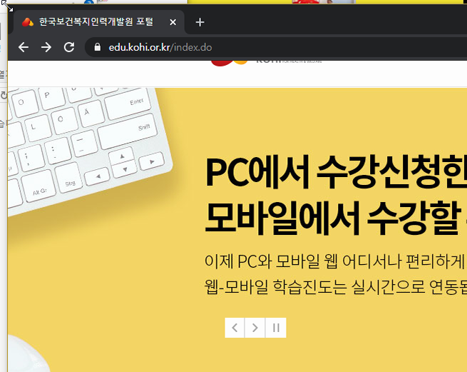 해당 홈페이지를 통해서 강의를 듣기 시작하면 앞으로 한국보건복지인력개발원 사이버교육홈페이지를 자주 찾게 되실 거예요. 이럴 땐 방문할 때마다 사이트를 검색하는 것이 번거로울 수 있으니, 빠르게 실행하는 버튼을 생성해두면 좋습니다. 우선 사이트를 띄운 뒤에 브라우저 크기를 조금 줄여주세요. 바탕화면이나 어떤 폴더가 보이는 정도로만 줄여주시면 됩니다.
