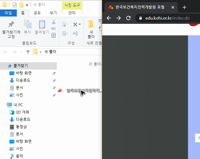 브라우저의 창 크기를 조절했다면, 주소창 왼쪽 부분에 커서를 올리고 드래그하면서 밖으로 꺼내주세요. 그럼 꺼낸 위치에 한국보건복지인력개발원 홈페이지를 빠르게 실행하는 아이콘이 생성될 것입니다.