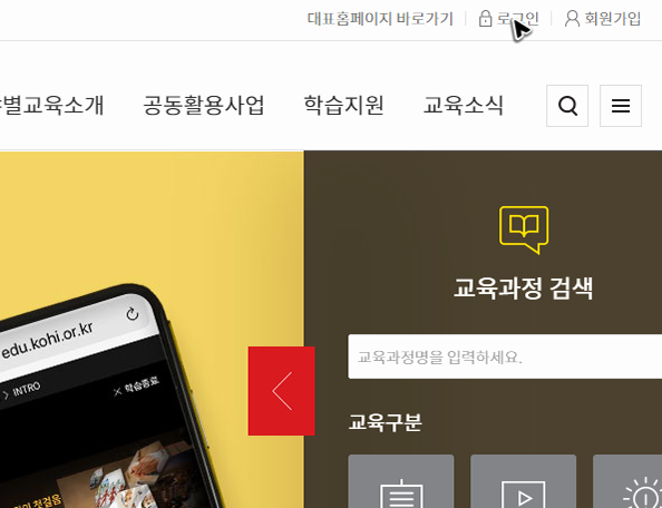사이트를 찾아가면 여러 가지 메뉴들이 나오지만, 우리가 이 사이트를 찾아온 가장 큰 이유는 온라인 강의를 듣고 보기 위함이죠? 그리고 온라인으로 강좌를 듣고 학습 과정을 진행하려면 로그인이 필수입니다. 그러니 홈페이지를 찾아간 뒤에는 메뉴를 둘러보기 전에 우측 상단의 로그인 버튼을 눌러서 로그인을 해주세요.