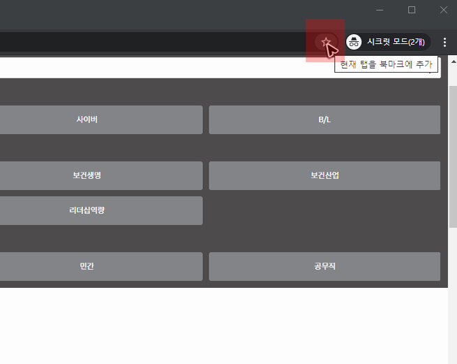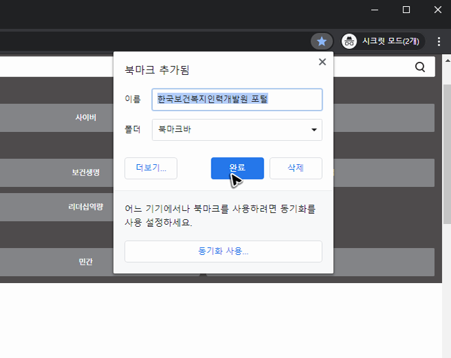 크롬 브라우저라면 북마크를 구성해서 쓸 수도 있습니다. 혹시 북마크를 구성해서 사용하고 싶으시다면, 마찬가지로 사이트를 띄운 상태로, 주소창 오른쪽에 있는 별표를 누르면 됩니다. 그럼 이름을 지정하는 설정 화면이 나오는데, 적당히 알아보기 쉬운 이름을 정하고 완료를 눌러주세요.