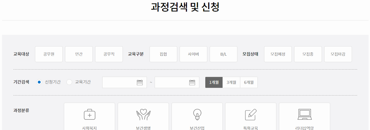 카테고리 메뉴를 누르면 과정을 검색하는 화면으로 연결이 될 거예요. 선택 옵션을 지정하면서 듣고 싶은 강좌를 찾고 안내에 따라 과정을 진행하시면 될 것 같습니다.
