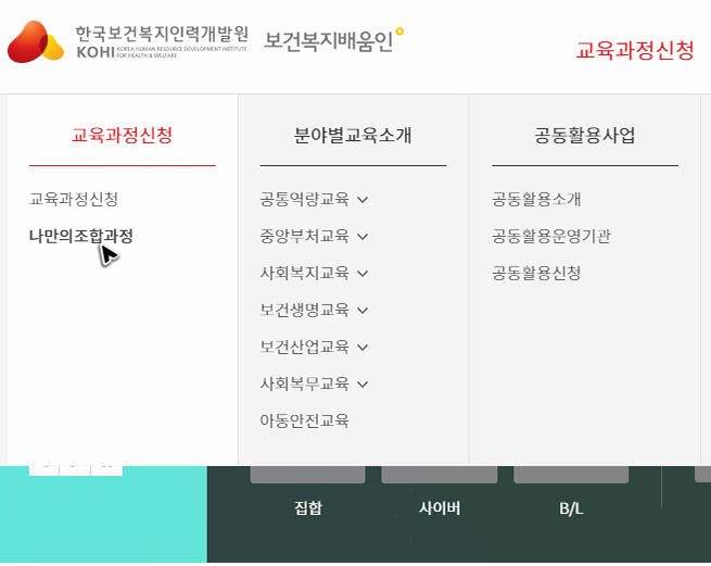 찾아온 한국보건복지인력개발원 사이버교육홈페이지의 특별한 기능이라 한다면, 나만의 조합 과정일 것입니다. 일반적인 인터넷 강의 사이트는 여러 종류의 커리큘럼이 구성되어 있고, 그 커리큘럼을 따라서 강좌를 들어야 하는데, 해당 홈페이지에서는 커리큘럼 안에서 필요한 부분만 추출하고 나만의 커리큘럼을 구성하는 것이 가능해요.