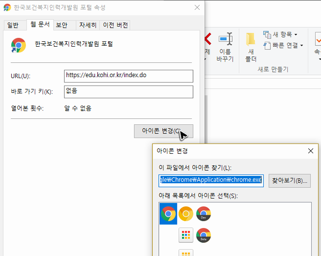 해당 아이콘은 기본 모양으로 구성이 되어 있어서 사용하는 것이 꺼려지거나 마음에 들지 않을 수 있어요. 이럴 땐 생성해둔 아이콘을 우 클릭한 뒤에 속성을 누르면 됩니다. 그럼 아이콘을 변경하는 메뉴를 찾을 수 있을 거예요. 물론 바꾸고 싶은 모양을 선택하면 됩니다. ICO 포맷이 사용되기 때문에 JPG나 PNG 등을 ICO 포맷으로 변환해서 아이콘을 변경하는 것도 가능해요.