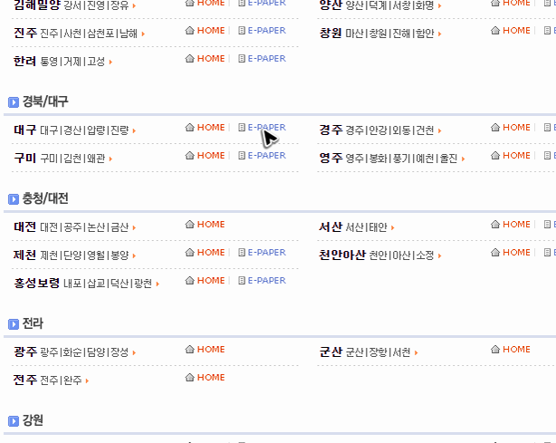 메뉴를 누르면 다양한 지역들이 정리된 상세 페이지로 연결이 될 거예요. 여기에서 일자리를 알아보고 싶은 지역을 선택한 뒤에 해당 항목 오른쪽에 보이는 E-PAPER라 적힌 버튼을 눌러주시면 됩니다. 저는 대구를 한 번 눌러볼게요.