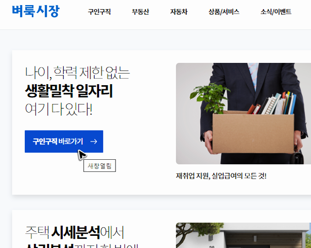 새롭게 띄워진 상단을 보면 간단한 탐색 기능들도 준비되어 있습니다. 지금은 벼룩시장 구인구직을 확인하기 위해서 찾아온 것이니, 모든 페이지를 확인하는 것보다는 상단에 정리된 탐색 기능에서 구인구직을 눌러서 필요한 정보가 있는 페이지로 빠르게 이동하고 정보를 확인하는 것이 더 좋은 선택이 아닐까 합니다.
