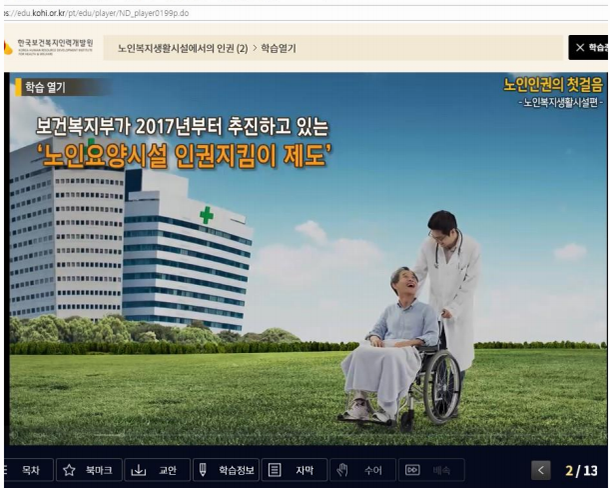 관련 시설 운영자와 종사자는 복지법에 따라 필수적으로 이수해야 할 kohi 사이버 교육이 있죠? 아마도 노인 인권 관련 교육이 가장 대표적인 과목일 것입니다.