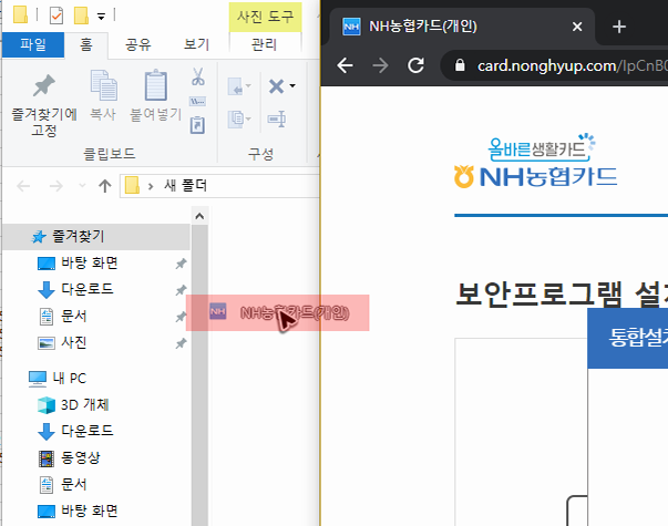 브라우저 창 크기를 적당히 수정했다면, 주소창 왼쪽 영역에 마우스 커서를 올려주세요. 그럼 페이지 정보가 나오는데, 그 상태에서 드래그 앤드 드롭을 하면서 미리 준비해둔 바탕화면이나 폴더로 꺼내주면 됩니다. 그럼 홈페이지로 농협카드를 띄우는 바로가기 아이콘이 생성될 거예요. 간단하죠?
