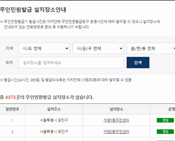 그리고 사이트 오른쪽을 보면 무인민원발급기라 적힌 메뉴가 있는데, 이 버튼을 누르면 무인민원발급기의 위치와 운영 시간을 확인할 수 있는 상세 페이지로 연결이 됩니다. 보통 무인 발급기는 주민센터보다 오래 일을 하고(?), 주말에도 운영을 하는 경우가 있기 때문에 한 번쯤 확인을 해보시면 좋을 것 같아요.