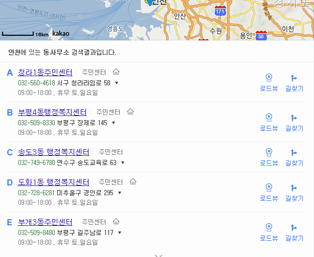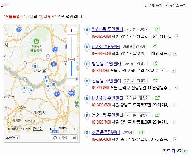 근처에 동사무소가 어디에 있는지 확인해보고 싶으시다면, 그냥 다음이나 네이버 등, 대형 포털 사이트에서 지역 이름과 함께 주민센터 또는 동사무소를 검색하면 됩니다. 그럼 검색 결과 상단에 지도와 근처에 있는 행정복지센터가 나올 거예요. 근무 시간과 휴일이 함께 나오고 번호도 나오는데, 찾아갈 시간이 점심 시간과 겹칠 것 같다는 생각이 든다면, 발걸음을 옮기기 전에 저나를 걸어서 한 번쯤 체크를 해보시면 좋을 것 같습니다.