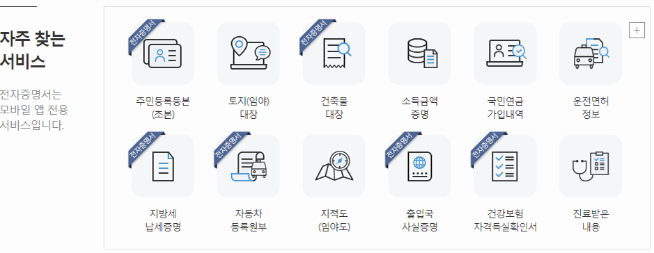사이트를 찾아가면 중간에 자주 찾는 서비스라 적힌 그룹이 보입니다. 여기에 많은 분들이 인터넷으로 발급하고 있는 서류들이 정리되어 있으니, 이 중에 내가 필요한 서류가 있는지 확인해보시면 될 것 같아요. 그 아래쪽에는 맞춤형 서비스가 그룹으로 정리되어 있는데, 진행하고 있는 업무와 관련된 정보가 필요할 땐 이 부분을 확인하시면 될 것 같습니다.