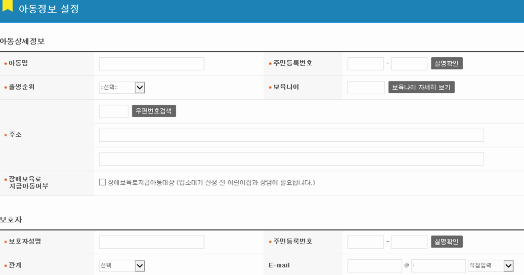이제 어린이 정보를 입력하는 화면이 나옵니다. 빈칸을 채우는 과정은 일반적인 커뮤니티 사이트의 회원 가입을 하는 것과 비슷하기 때문에 특별히 어려운 구석은 없을 거예요. 이렇게 빈칸을 채우면 일단은 실질적인 첫 번째 단계라 할 수 있는 입소대기 아동 등록 과정은 마무리가 됩니다.