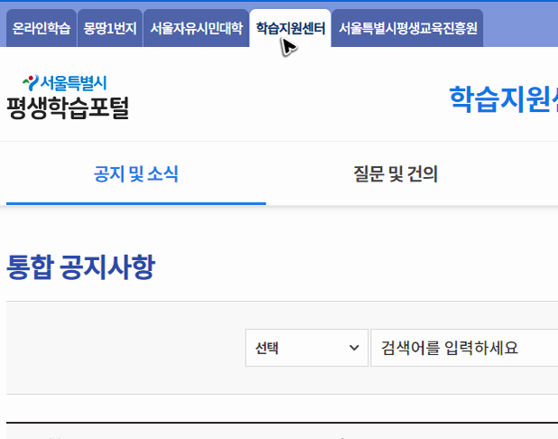 앞에서 적어둔 내용에 따라서 학습자료들을 열람하고 포털 사이트를 활용하시면 되는데, 혹시 해당 사이트를 이용하면서 어려운 부분이 생긴다거나, 오류가 생긴다면, 학습지원센터라 적힌 메뉴를 눌러주세요. 그럼 공지된 내용을 볼 수도 있고, 질문을 할 수도 있습니다. 상황에 맞게 활용하시면 될 것 같아요.
