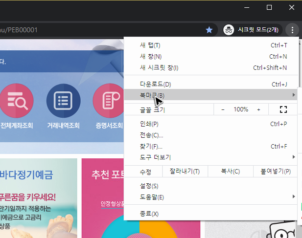혹시 저처럼 크롬 브라우저를 사용하고 있으시다면, 우측 상단에 있는 점 세 개가 그려진 버튼을 눌러서 북마크 목록을 불러오거나, 키보드에서 [Ctrl, Shift, B]를 동시에 눌러서 북마크 목록을 불러올 수도 있습니다. 목록에 있는 항목을 클릭하면 부산은행이 됐든, 다른 은행이나 다른 사이트가 됐든, 바로 페이지 이동을 하실 수 있을 거예요.