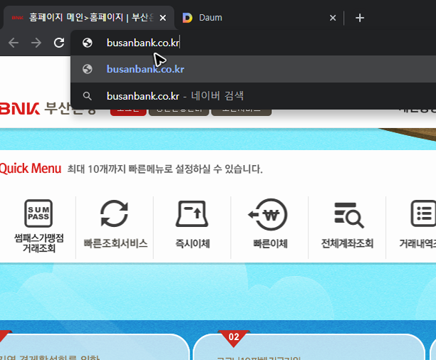 특별히 아는 사람만 찾아갈 수 있는 그런 온라인 은행이 아니죠? 온라인 뱅킹을 필요로 하시는 모든 분들이 찾아갈 수 있는 페이지이고, 검색만 하면 간단하게 찾을 수 있습니다. 하지만 검색은 귀찮아요. 그러니 [busanbank.co.kr]를 주소창에 입력해서 부산은행의 인터넷뱅킹하는 홈페이지로 이동을 해주세요.