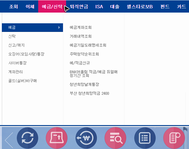 개인뱅킹을 클릭해서 전용 부산은행 인터넷뱅킹의 홈페이지로 이동했다면, 마찬가지로 카테고리 메뉴를 살펴보시면서 필요한 금융 업무의 종류를 찾고 클릭을 해주시면 될 것 같습니다. 메뉴가 워낙 많아서 필요한 서비스를 찾는 것이 어려울 수도 있는데, 이럴 땐 우측 상단의 검색 기능을 활용하시면 될 것 같아요.