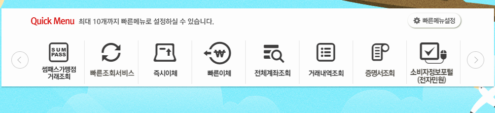검색하거나 제가 적어둔 주소를 클릭해서 부산 온라인 은행으로 이동을 하셨다면, 중간에 퀵 메뉴를 확인해주세요. 많은 분들이 이용하고 있는 서비스 위주로 정리된 것이기 때문에 보통은 여기에서 필요한 금융 업무를 찾으실 수 있을 것입니다. 퀵 메뉴에서 필요한 기능을 찾을 수 없다면, 상단의 개인뱅킹이라 적힌 메뉴를 클릭하시면 될 것 같아요.