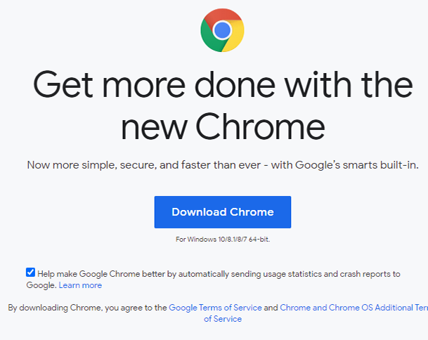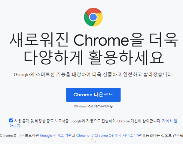 검색이나 주소를 입력해서 공식 google chrome 홈페이지를 방문하셨다면, 중간에 있는 chrome 다운로드 버튼을 누르면 됩니다. 그럼 windows용 설치 파일을 받을 수 있어요. 파일을 받는 버튼 아래쪽을 보면 한 가지 선택 옵션이 보이는데, 이 부분은 기호에 따라 선택을 해주시면 될 것 같아요.