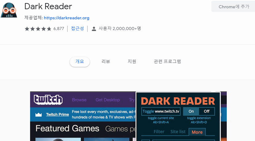 아마 처음으로 확장 도구들을 살펴보시면 어떤 것을 선택해야 할지 어려운 구석이 있을 거예요. 그래서 개인적으로 괜찮다 싶은 크롬의 확장 도구를 몇 가지만 얘기를 해보겠습니다. 첫 번째로 얘기할 수 있는 확장 도구는 Dark Reader 입니다. 해당 도구를 설치하면 브라우저를 전반적으로 어두운 컬러로 구성할 수 있어요. 밤에 웹 서핑을 하시는 경우가 많다면, 이 도구로 눈을 조금 더 편하게 하실 수 있을 거예요.