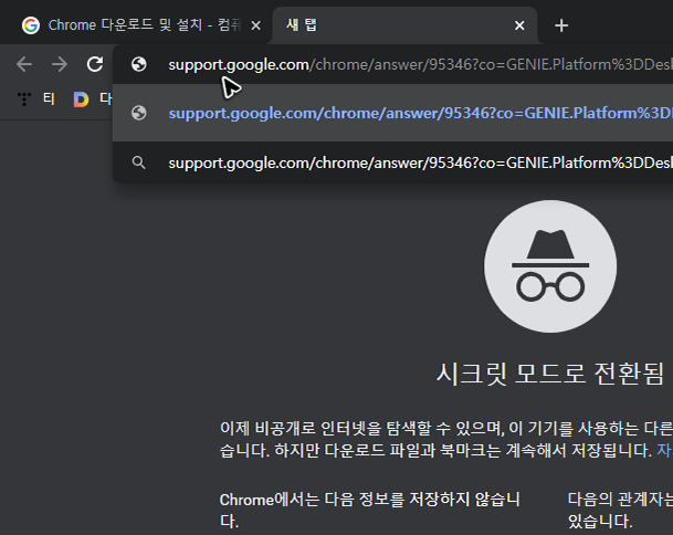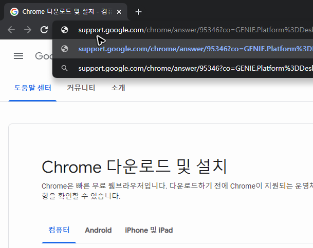 보통은 온라인 설치 파일이면 충분하실 텐데, 가끔 PC 환경에 따라 온라인 설치 파일이 제대로 작동하지 않는 경우가 있어요. 그리고 다른 이유로 오프라인 설치가 가능한 파일이 필요한 상황이 있을 수도 있습니다. 이럴 땐 공식 메인 페이지가 아닌 서비스 안내 페이지를 찾아가야 하는데, 검색하는 것보다는 [support.google.com/chrome/answer/95346?co=GENIE.Platform%3DDesktop&hl=ko]를 주소창에 입력해서 google chrome이 있는 곳으로 이동하시는 것이 더 편하실 거예요.