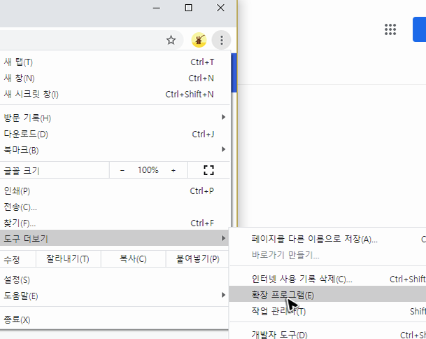 그리고 크롬의 꽃은 역시 확장 프로그램이 아닐까 해요. 내게 필요한 기능들을 브라우저에 추가해서 작업 효율을 높이거나, 최적화를 하는 것에도 도움을 받을 수 있는데, 혹시 평소 즐겨하는 작업이 있다면 작업 효율을 높일 수 있는 확장 도구를 꼭 추가하시기 바랍니다. 우측 상단의 메뉴를 누르고 Chrome 웹 스토어를 누르면 확장 프로그램을 검색할 수 있는 스토어로 연결이 될 거예요.