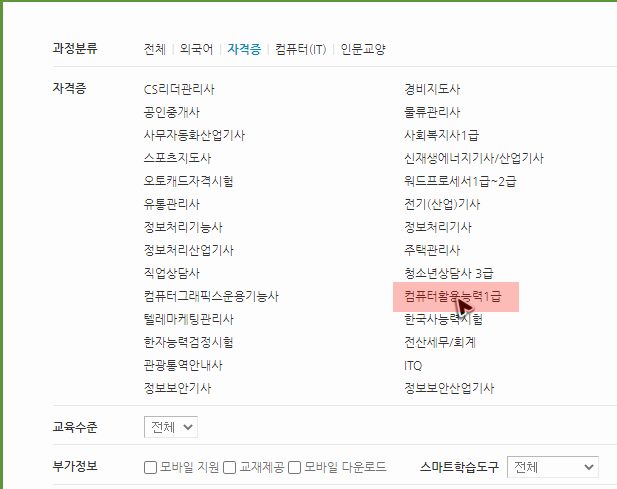 제가 적어둔 주소를 복사해서 홈페이지를 찾아간 뒤에는 상단 카테고리 메뉴를 둘러보면서 들어보고 싶은 교육을 찾으면 됩니다. 아마 컴활 강좌를 듣기 위해서 사이버교육 사이트를 찾으신 분들이 많으실 테니, 컴활에 대해서 조금 얘기를 해볼게요. 일단 상단의 자격증이라 적힌 메뉴를 눌러주세요.