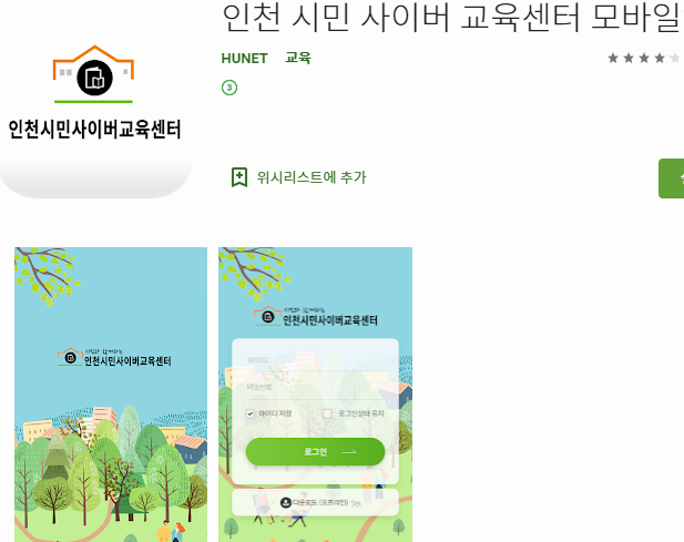 앱은 그냥 플레이스토어를 열고 사이버교육을 검색하면 됩니다. 그럼 강좌를 볼 수 있었던 홈페이지와 동일한 인천시민을 위한 앱이 보일 거예요. 그 앱을 설치해서 실행해주시면 됩니다. 앱을 사용하는 방법은 홈페이지와 마찬가지로 로그인을 한 뒤에 수강하고 싶은 강좌를 찾고 신청하는 것이 전부라 특별히 어려운 구석은 없을 거예요.