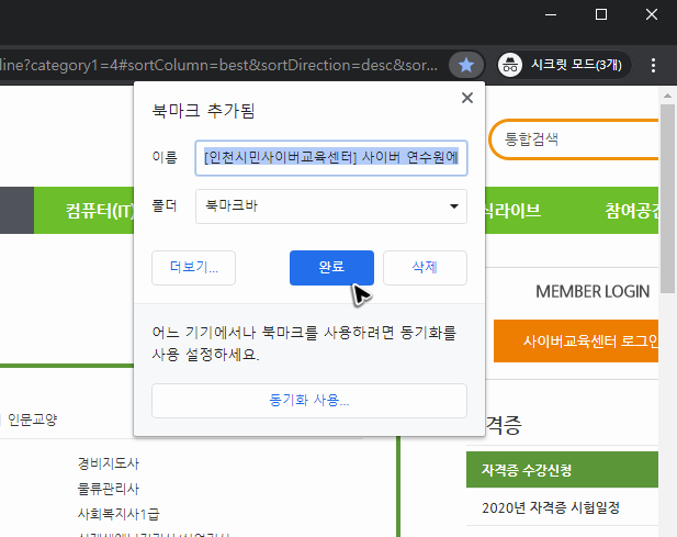 북마크 목록을 구성한 뒤에는 별표 모양의 버튼을 한 번 더 누르면 목록을 확인할 수 있습니다. 목록에서는 인천시민의 교육센터를 클릭해서 빠르게 강의 사이트를 찾아가실 수 있을 거예요. 혹시 저처럼 크롬을 사용하고 있으시다면 [Ctrl + Shift + B]를 눌러서 목록을 불러오는 것도 가능합니다.