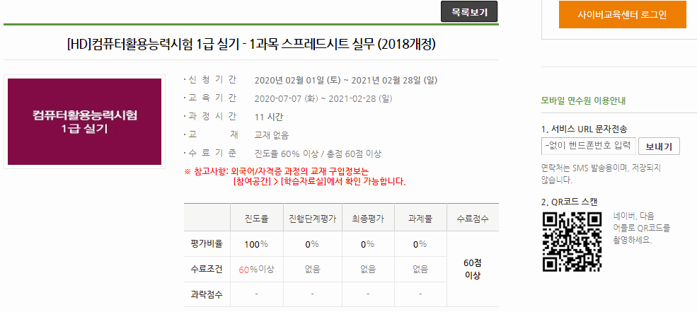 요즘에는 온라인 교육 자료가 엄청 많죠? 심지어 무료도 있습니다. 대표적인 종류가 인천시민 사이버교육센터 강좌일 텐데, 제가 알기로 컴활 자격증 교육을 받기 위해서 사이트를 찾는 경우가 많아요.