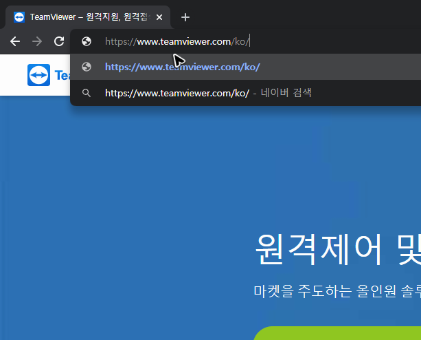 주소를 입력하고 공식 홈페이지로 이동하면 중간에 세 개의 버튼이 보일 거예요. 만약 설치해서 사용하는 팀뷰어를 쓰고 싶으시다면, 초록색 버튼을 클릭하면 됩니다. 그리고 저처럼 포터블을 선호하시거나, 다른 버전이 필요하다면, 상단의 다운로드를 클릭해주세요.