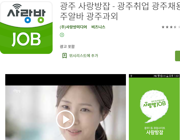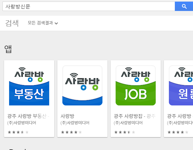 앱을 설치하고 싶을 땐, 그냥 플레이스토어를 실행하고 광주사랑방신문을 검색해주세요. 그럼 관련 앱들이 나오는데, 이 중에서 JOB이라 적힌 어플을 선택하고 설치하시면 됩니다. 설치 과정은 익숙하실 테고, 사용법은 홈페이지와 마찬가지로 메뉴를 누르고 정보를 둘러보는 것이 전부이니, 따로 설명할 내용이 없을 것 같아요.