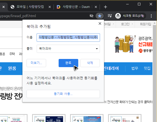 저처럼 크롬을 사용하고 있으시다면, [Ctrl + Shift + B]를 눌러서 북마크를 불러올 수 있고, 우측 상단의 메뉴를 눌러서 목록을 불러온 뒤에 그 안에 있는 광주사랑방을 클릭해서 사이트 이동을 하실 수도 있습니다.