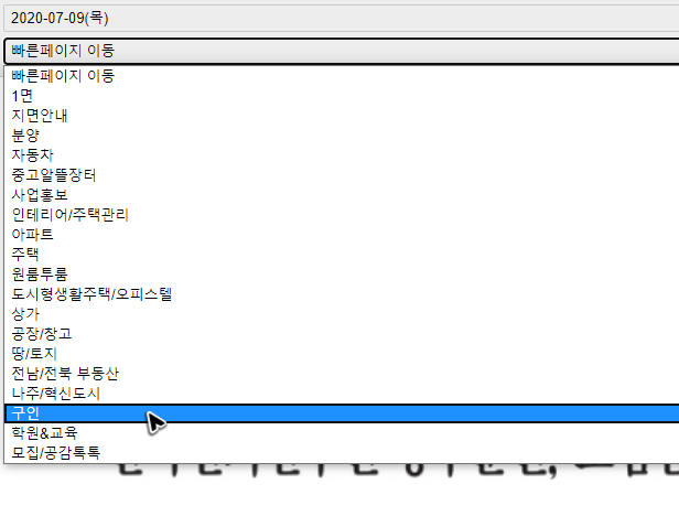 메뉴를 누르면 커다란 화면이 새롭게 열리는데, 상단의 빠른 페이지 이동 메뉴를 확인하시면 구인구직이 있는 사랑방신문의 페이지로 빠르게 이동할 수 있습니다. 그리고 우측 상단에 있는 화살표를 클릭해서 보기를 하는 페이지를 이동하는 것도 가능하니 활용하시면 될 것 같아요.