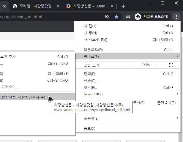 저처럼 크롬을 사용하고 있으시다면, [Ctrl + Shift + B]를 눌러서 북마크를 불러올 수 있고, 우측 상단의 메뉴를 눌러서 목록을 불러온 뒤에 그 안에 있는 광주사랑방을 클릭해서 사이트 이동을 하실 수도 있습니다.