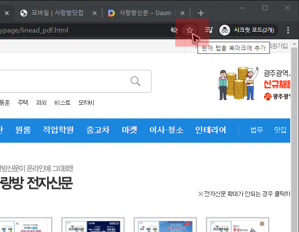 사실 아무리 많은 구인 정보가 광주사랑방신문에 올라온다고 하더라도 구직을 하는 것은 하루만에 끝나는 경우가 드물죠? 내게 맞는 좋은 일자리를 찾기 위해서는 광주사랑방신문의 구인구직 정보를 수시로 확인하는 것이 좋습니다. 그런데 다음에 일자리를 확인하기 위해서 또 검색하는 것은 아무래도 귀찮은 감이 있어요. 그러니 이번 기회에 북마크에 추가해두는 것을 권장합니다.