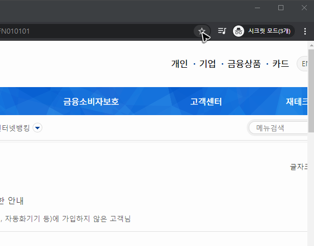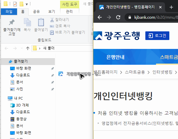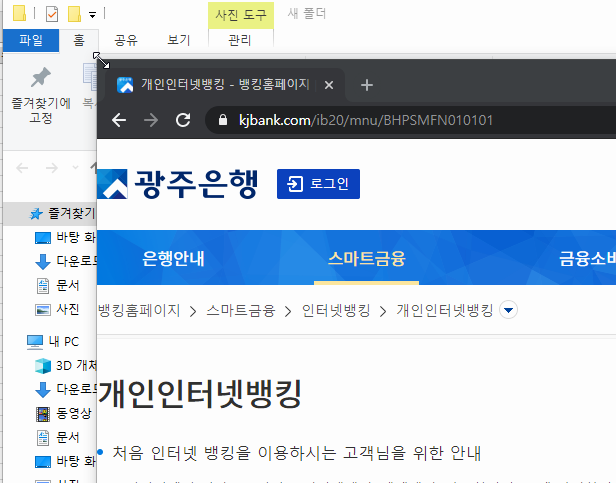이렇게 북마크를 구성해서 광주은행으로 이동할 수 있고, 아이콘을 따로 구성해서 사용할 수도 있습니다. 다른 브라우저에서 동일한 방법으로 작업이 가능한지는 잘 모르겠지만, 크롬을 사용할 땐 그냥 브라우저 창 크기를 조금 줄이면 됩니다.