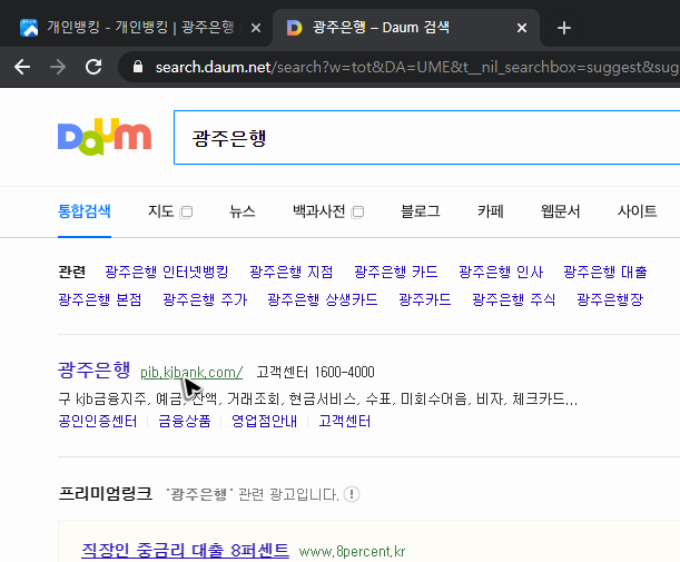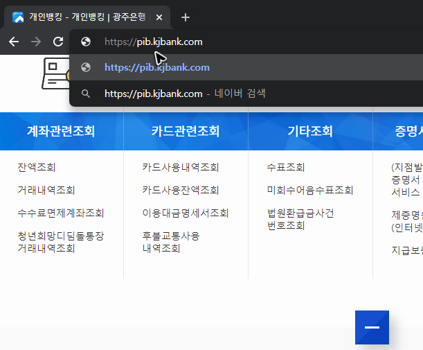 특별히 숨겨진 상태로 관리되고 있는 사이트가 아니죠? 고로 검색하면 빠르게 공식 사이트를 찾아갈 수 있는데, 이 글을 읽기 전에 이미 검색을 한 번 해보셨을 테니, 또 다시 검색하는 것은 아무래도 귀찮을 수 있어요. 그러니 실행해둔 브라우저에서 주소창에 [pib.kjbank.com]를 입력한 뒤에 광주은행의 인터넷뱅킹으로 바로가기를 해주세요.