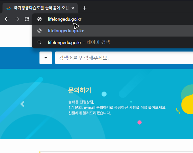 유명한 곳이고 특별히 비밀스러운 곳도 아니기 때문에 포털에서 검색하면 빠르게 찾아갈 수 있겠지만, 검색하는 것은 아무래도 귀찮을 수 있어요. 그러니 국가평생학습포털에서 늘배움의 강좌를 살펴보고 싶을 땐, 그냥 주소창에 [lifelongedu.go.kr]를 입력해서 페이지 이동을 해주세요.
