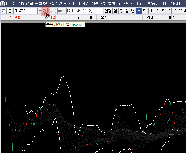숫자나 화면 이름을 정확하게 입력하면 차트가 열릴 거예요. 차트를 실행한 뒤에는 왼쪽 상단에 보이는 돋보기를 눌러주세요. 그럼 종목검색을 위한 화면이 나오는데, 에너지 그룹으로 이동하면 WTI를 비롯한 브렌트유, 천연가스 등의 종목을 확인할 수 있습니다. 월물까지 선택을 해주시면 차트에서 선택한 종목을 실시간으로 보여줄 거예요.