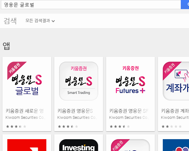 공식 홈페이지를 찾아간 뒤에는 오른쪽으로 시선을 옮겨주세요. 그럼 계좌 개설이 보이고, 영웅문4가 보이고, 영웅문 글로벌이 보입니다. 우리는 선물의 시세 조회를 하는 것이 목적이니 그냥 영웅문 글로벌만 받으면 됩니다. 정확한 클릭 위치는 하단 그림에서 커서가 있는 곳을 확인해보시면 될 것 같아요.