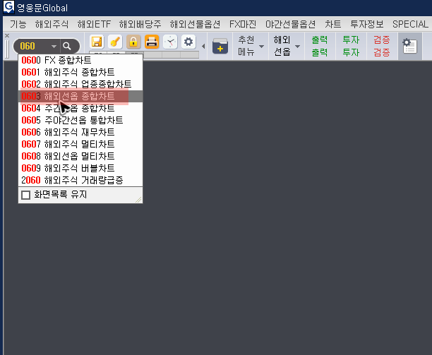 혹시 HTS로 국제유가를 확인하고 싶으시다면, 증권사에서 제공하는 HTS를 컴퓨터에 설치하고 실행한 뒤에 차트를 띄우고 종목을 선택하면 됩니다. 저는 키움의 영웅문 Global을 사용하고 있어서 해당 HTS를 기준으로 선물을 확인하는 방법에 대해 얘기를 해볼게요.