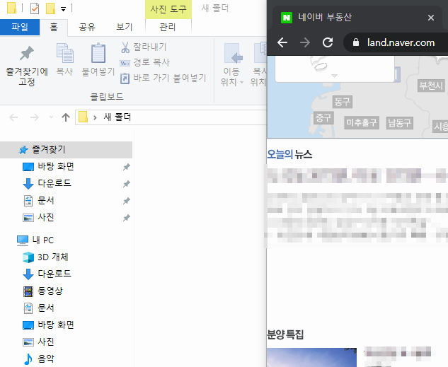 그리고 크롬이나 익스플로러 등, 몇몇 브라우저는 즐겨찾기 목록을 구성하는 것이 아니라 아이콘을 따로 생성하는 것도 가능한데, 혹시 아이콘 생성으로 네이버 부동산으로 바로가기를 하고 싶으시다면, 일단 브라우저 창 크기를 조금 줄여서 바탕화면이나 아이콘을 보관할 폴더가 보이도록 해주세요.