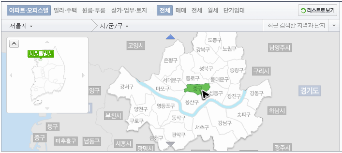 주소를 입력하고 네이버 바로가기를 했다면, 위쪽 영역에 지도가 있는 부분이 보일 거예요. 여기에서 매물을 알아보고 싶은 부동산 위치를 선택해주시면 됩니다. 지도에서 위치를 클릭해도 괜찮고, 지도 왼쪽 상단에 있는 카테고리에서 지역을 선택하셔도 괜찮아요.