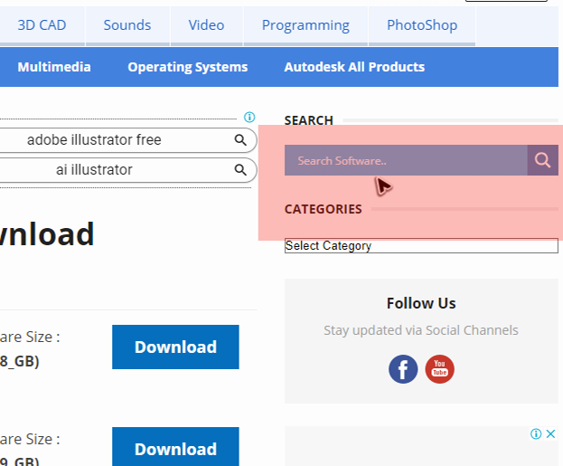 위에 적어둔 자료실은 국내 사이트가 아니기 때문에 주소를 입력하고 찾아가면 다소 난잡한 느낌이 있을 거예요. 하지만 사용하는 방법이 어렵지 않기 때문에 걱정할 필요는 없습니다. 그냥 우측 상단을 보면 검색하는 공간이 보이는데, 여기에 adobe나 illustrator와 같은 관련된 단어를 적당히 입력하고 엔터를 눌러주세요.