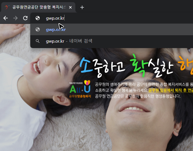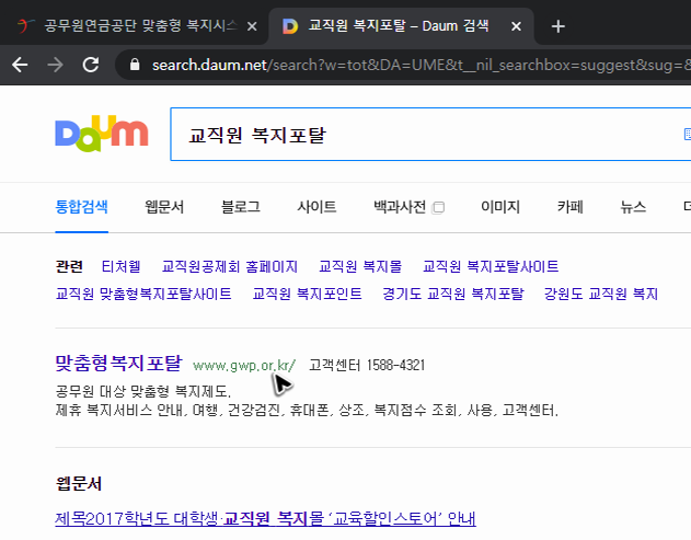 혜택을 누릴 수 있는 공무원 분들이 빠르게 찾아올 수 있도록 포털에서 검색하면 가장 위쪽에 정리되는 사이트입니다. 고로 검색하면 찾아갈 수 있어요. 다만, 검색은 귀찮죠? 그러니 주소창에 [gwp.or.kr]를 입력해셔서 교직원의 맞춤형복지포탈사이트와 등록하는 곳으로 이동을 해주세요.
