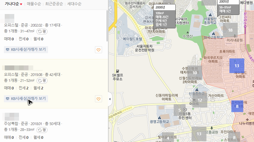 지도 위에 있는 숫자를 클릭하면 선택한 위치에 있는 부동산의 목록이 왼쪽에 정리될 거예요. 그리고 정리된 각각의 항목 아래쪽을 보면 KB시세, 실거래가 보기 버튼이 있습니다. 물론 클릭하면 됩니다.